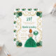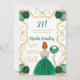 La invitación a la fiesta de cumpleaños incluye un marco dorado elegante, una bella princesa con el pelo rojo y un vestido verde, flores y un globo. Esto es perfecto para una fiesta de cumpleaños.