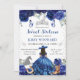 Una encantadora invitación azul para Sweet Sixteen que presenta a una princesa de pelo oscuro con estilo de salón con un vestido de baile fluido, rodeada de rosas azules y púrpuras exuberantes, mariposas y detalles de brillo plateado suave. Elementos rústicos elegantes como la silueta de caballo de plata, botas de vaquera florales y herradura añaden un toque único y elegante, manteniendo el diseño elegante y festivo. Un delicado motivo de tiara corona el diseño, y la tipografía moderna de fuentes mixtas destaca la celebración de este hito con un toque pulido y femenino. La rica paleta azul, los toques caprichosos del oeste y la elegante silueta de princesa crean una invitación mágica y de alta calidad perfecta para una inolvidable celebración de Sweet 16.