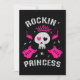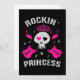 Diseño adorable que presenta una calavera con ojos en forma de corazón y dos guitarras eléctricas cruzadas, y la cita "Princesa Rockera".