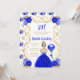 Esta invitación a la fiesta de cumpleaños incluye un marco dorado elegante, una bella princesa con el pelo rubio y un vestido azul real, flores y un globo. Esto es perfecto para una fiesta de cumpleaños.