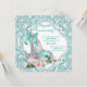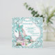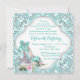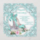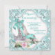 Elegante invitación de Quinceañera azul turquesa con zapato de tacón alto azul turquesa y tiara de joyas de diamante en un hermoso fondo de remolino azul turquesa. Esta invitación de Quinceañera de princesa de cuento de hadas se personaliza fácilmente para su evento simplemente agregando sus detalles en el estilo de fuente y color y redacción de su elección. También puede cambiar el color de fondo.