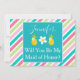Una forma creativa de pedirle a su empleada de honor que sea parte de su boda, esta invitación presenta un bonito fondo rosa, verde y azul diagonalmente rayado con una caja azul y blanca en el medio. La caja tiene una plantilla para personalizar su nombre con "¿Serás mi doncella de honor?" escrito con una bonita letra en blanco. ¡Personaliza el tuyo hoy! Diseño de invitaciones: Bodas por Rhoadie Bandas de fondo: AMBilustraciones http://www.etsy.com/shop/AMBillustrations/ Piña y flores: Diseño de Prettygrafik (https://www.etsy.com/shop/Prettygrafikdesign)
