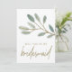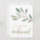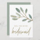 Esta tarjeta de proposición de la dama de honor con estilo de eucalipto es perfecta para una boda elegante. El diseño es sencillo y delicado, con un purpurina de oro falso que recubre las ramas de las hojas verdes de oliva. Personalizar la tarjeta con el nombre de la novia y la dama de honor. Personaliza la parte posterior de la tarjeta con un mensaje personalizado. Nota: Este diseño no tiene purpurina de oro real. Es un gráfico de alta calidad hecho para parecer un shimmer dorado.