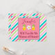 Una forma maravillosa de pedirle a su Matrón de Honor que sea parte de su boda, esta invitación tiene un bonito fondo rosado, verde y azul diagonalmente rayado con una caja rosa y azul en el medio. La caja tiene una plantilla para personalizar su nombre con "¿Serás mi Matrón de Honor?" escrito con una bonita letra en burdeos. ¡Personaliza el tuyo hoy! Diseño de invitaciones: Bodas por Rhoadie Bandas de fondo: AMBilustraciones http://www.etsy.com/shop/AMBillustrations/ Piña y flores: Diseño de Prettygrafik (https://www.etsy.com/shop/Prettygrafikdesign)