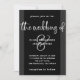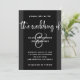 Esta impresionante invitación a la boda presenta un fondo negro con bordes oscuros, grises de carbón y tipografía moderna de escritura manuscrita blanca. Un aspecto sencillo y contemporáneo con un texto ampersante y llamativo.