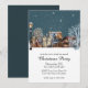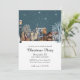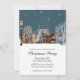 Esta invitación personalizada para fiestas navideñas o de Navidad presenta una ilustración de estilo acuarela acogedora. Una imagen de un pequeño pueblo invernal por la noche está impresa en la parte central. Un poste de luz iluminado se ve a la izquierda y la nieve que cae cubre suavemente las casas del pueblo.