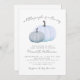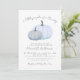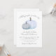 Una calabaza pequeña está en camino - Invitación al otoño en Baby Shower Celebrar la próxima llegada con esta dulce y simple invitación a la ducha de bebé, perfecta para un niño e ideal para una reunión de otoño o otoño. En la parte superior, la frase "Una calabaza está en camino" está escrita con fuentes grises usando una mezcla de escritura a mano y estilos serif clásicos para un aspecto suave y elegante. El diseño incluye dos calabazas en tonos azules suaves cerca del fondo, lo que mantiene las cosas mínimas y dulces sin salpicaduras ni superposiciones adicionales. Un fondo blanco limpio mantiene el aspecto general sencillo y moderno, mientras que los detalles de los eventos están claramente dispuestos debajo de la ilustración para coordinar fuentes grises. Esta invitación es totalmente personalizable: puede cambiar el texto, los tipos de letra y el diseño para que se ajuste perfectamente a su evento. Una buena elección para una ducha de bebé durante la temporada de otoño, pero lo suficientemente suave y dulce como para trabajar en cualquier época del año. Disponible como una invitación impresa o un archivo digital descargable para enviar e-mail o imprimir localmente.