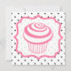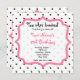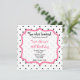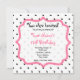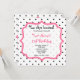 Invitación a una fiesta de cumpleaños con un fondo blanco con pequeños puntos de polka negro en la parte delantera y trasera. Marcos rosas en la parte delantera y trasera. Personalice el texto en la parte delantera con los detalles de su evento. En la parte trasera hay un ilustracion de quequito rosa y blanco.