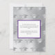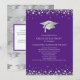 This modern design features a graduation hat and confetti in silver on a background of purple with white text.