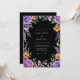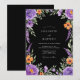 This design features a striking black backdrop that allows the vibrant floral arrangement to pop. Rich purple roses and delicate lavender sprigs are paired with bright orange blossoms and lush green leaves. The mood is dramatic and sophisticated, perfect for an evening event. The watercolor style adds a touch of artistic elegance to the botanical border.