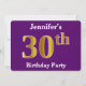 Este diseño de invitación presenta el número ordinal "30" con un aspecto falso dorado. También tiene un nombre personalizado y un fondo morado. Los detalles del evento en la parte posterior se pueden personalizar. Se podría usar para invitar a la gente a la fiesta de 30 años de alguien. [~Z0000014]