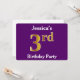 Este diseño de invitación presenta el número ordinal "3rd" con un aspecto falso dorado. También tiene un nombre personalizado y un fondo morado. Los detalles del evento en la parte posterior se pueden personalizar. Se podría usar para invitar a la gente a la fiesta de tercer cumpleaños de alguien. [~Z0000014]