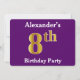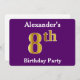 Este diseño de invitación presenta el número ordinal "8th" con un aspecto falso de oro. También tiene un nombre personalizado y un fondo morado. Los detalles del evento en la parte posterior se pueden personalizar. Se podría usar para invitar a la gente a la fiesta de octavo cumpleaños de alguien. [~Z0000014]