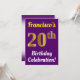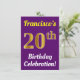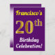 Este diseño de invitación para fiestas de cumpleaños incluye un mensaje como "¡La celebración de cumpleaños número 20 de Francisco!", donde el nombre puede ser personalizado, y donde el número "20" tiene una apariencia falsa de oro. También tiene un fondo morado. Los detalles del evento en la parte posterior se pueden personalizar. Se podría usar para invitar a la gente a la celebración de cumpleaños veinte o fiesta de cumpleaños de alguien. [~Z0000121]