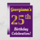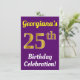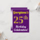Este diseño de invitación para fiestas de cumpleaños incluye un mensaje como "¡La celebración de cumpleaños número 25 de Georgiana!", donde el nombre se puede personalizar, y donde el número "25" tiene una apariencia falsa de oro. También tiene un fondo morado. Los detalles del evento en la parte posterior se pueden personalizar. Se podría usar para invitar a la gente a la celebración de 25 años o fiesta de cumpleaños de alguien. [~Z0000121]