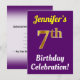Este diseño de invitación para fiestas de cumpleaños incluye un mensaje como "¡La celebración de cumpleaños número 7 de Jennifer!", donde el nombre puede ser personalizado, y donde el número "7" tiene una apariencia falsa de oro. También tiene un fondo morado. Los detalles del evento en la parte posterior se pueden personalizar. Se podría usar para invitar a la gente a la celebración de séptimo cumpleaños o fiesta de cumpleaños de alguien. [~Z0000121]