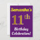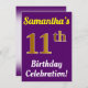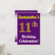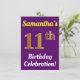 Este diseño de invitación para fiestas de cumpleaños incluye un mensaje como "¡Celebración de cumpleaños número 11 de Samantha!", donde el nombre se puede personalizar, y donde el número "11" tiene una falsa apariencia dorada. También tiene un fondo morado. Los detalles del evento en la parte posterior se pueden personalizar. Se podría usar para invitar a la gente a la celebración de su undécimo cumpleaños o fiesta de cumpleaños. [~Z0000121]