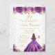 This elegant and glamorous birthday party invitation features a beautiful princess with brunette hair and fair skin in a dark purple ball gown. The text combines handwritten script and modern sans serif fonts for a classy and sophisticated look. The floral arrangements, butterflies and gold confetti create the perfect blend of rustic and chic.