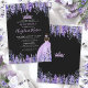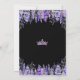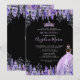 Tiara Watercolor Floral Purple Quinceañera Invitation. This charming design features a watercolor lilac and lavender garden with green leaves, creating a whimsical yet elegant look. A sparkling purple princess tiara sits at the top, and a girl in a purple sparkling gown appears on the back. Classic serif and script fonts add sophistication, all set against black backgrounds on both sides for a striking, elegant effect. All fonts and colors can be customized.