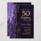 Invitación a la fiesta de cumpleaños 50 años de morado y oro. Elegante diseño moderno con fondo geodésico de mármol agate acuarela, oro falso purpurina y tipografía de escritura. La carta de invitación de moda es perfecta para una elegante celebración del cumpleaños de las mujeres. Invitaciones Zazzle impresas o una plantilla imprimible digital de descarga instantánea.