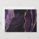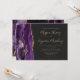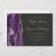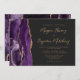 El borde izquierdo de esta elegante y moderna invitación a la boda incluye un borde de ágata color morado adornado con un falso purpurina de oro. El texto del personalizable combina escritura moderna de color dorado, copperplate y tipografías cursivas sobre un fondo negro de pizarra. El reverso presenta un diseño de agate morado y dorado a juego.