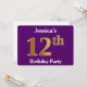 Este diseño de invitación presenta el número ordinal "12th" con un aspecto falso dorado. También tiene un nombre personalizado y un fondo morado. Los detalles del evento en la parte posterior se pueden personalizar. Se podría usar para invitar a la gente a la fiesta de 12 años de alguien. [~Z0000014]
