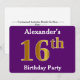 Este diseño de invitación presenta el número ordinal "16th" con un falso aspecto dorado. También tiene un nombre personalizado y un fondo morado. Los detalles del evento en la parte posterior se pueden personalizar. Se podría usar para invitar a la gente a la fiesta de cumpleaños dieciséis de alguien. [~Z0000014]
