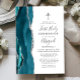 La arista izquierda de esta elegante y moderna invitación a la primera comunión cuenta con un verde azulado borde de batido de color azul con un falso purpurina plateado. Una falsa cruz de Relieve metalizado plateado aparece encima del texto del personalizable, que combina escritura a mano, copperplate y tipografías cursivas en gris carbonero sobre un fondo blanco. El reverso presenta un diseño de ágate azul y plata verde azulado.
