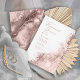 Un fondo abstracto que recuerda al mármol en tonos rosa pálido a través de la taupe, con un brillante oro rosa, es el telón de fondo de un texto de escritura elegante y de diseños modernos en las piezas de esta hermosa suite boda. La invitación que se muestra aquí incluye el texto de guión de arriba más el texto opcional de "Cena ensayada" y una plantilla para añadir los detalles pertinentes del evento. Buscar ID644 para ver todas las piezas de coordinación de este conjunto.