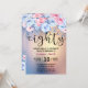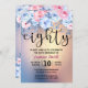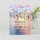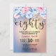 Hermosa Invitación Moderna de Cumpleaños 80. Diseño de fondo acuarela con purpurina dorado y elementos florales en rosa y azul.