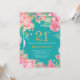 Invitación a los 21 Años Florales para Mujeres. Flor floral botánica acuarela.Brillantina dorada. Fondo Verde azulado Aqua Turquesa. Flores Florales De Peonies Rosados. Cumpleaños de adultos.