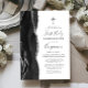 La arista izquierda de esta elegante y moderna invitación a la primera comunión cuenta con un borde de batida de color negro adornado con un falso purpurina de plata. Una falsa cruz de Relieve metalizado plateado aparece encima del texto del personalizable, que combina escritura a mano, copperplate y tipografías cursivas en gris carbonero sobre un fondo blanco. El reverso presenta un diseño de ágata negro y plateado a juego.