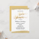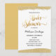 Invite a sus amigos y familiares a que celebren a su bebé para que venga con estas encantadoras invitaciones para la ducha de bebé. Delante de la tarjeta: "Por favor, únete a nosotros por una" en mayúsculas negras en la parte superior de la tarjeta. Bajo él está escrito, en letras cursivas doradas, "Baby Shower", seguido de "en honor de" en mayúsculas negras, seguido por el nombre de su bebé en letras cursivas negras, seguido, nuevamente en las capitales negras, de la fecha y dirección del evento. El fondo es blanco. También hay dos franjas de oro desiguales con una arena como la textura en la parte superior y muy inferior. Parte posterior de la tarjeta: Fondo dorado.