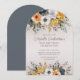 Invitación a la fiesta de cumpleaños 90 en forma de arco para ella con hermosa marina y polvorientas flores de color azul y mostaza amarilla. Comuníquese conmigo para obtener ayuda con sus personalizaciones o para solicitar la correspondencia o coordinación de los productos de Zazzle.