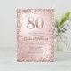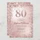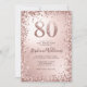 Celebra con estilo esta glamorosa invitación de cumpleaños número 80, perfecta para una fiesta de cumpleaños de un hito. Con un fondo de oro metálico subió con un efecto de foco en el reluciente número 80, esta invitación brilla con acentos de confetti purpurina y metálico que crean un marco elegante y festivo. Ideal para fiestas de cumpleaños sofisticadas, invitaciones de cumpleaños de lujo o un fiesta con temática de oro subió, esta invitación está diseñada para atraer a los invitados y marcar la pauta para una celebración brillante.