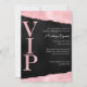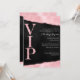 Este fiesta personalizado o invitación a un evento presenta un tema VIP glamuroso en rosa y negro. El fondo tiene un patrón de gradiente de Relieve metalizado negro en el centro, con lágrimas abstractas de Relieve metalizado rosa brillante que atraviesan la parte superior e inferior. El título VIP se imprime verticalmente a la izquierda, en una gran fuente purpurina rosa.