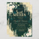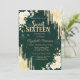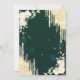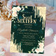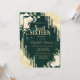 Una invitación moderna, de moda y glamurosa con goteos purpurinas y flores en un fondo verde.