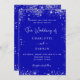 Un fondo azul real, decorado con purpurinas falsos de plata, chispas. Personalice y agregue sus nombres y detalles. Atrás: un código qr. Agregue la URL de su sitio web boda para obtener detalles del boda y RSVP.