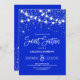 Esta majestuosa y glamorosa y dulce invitación para 16 cumpleaños es perfecta para la muchacha. Cuenta con hilos brillantes de luz colgante encima de un falso purpurina de color brillante de plata impreso en un fondo azul real inspirado en estrellas en el cielo nocturno. Es bonito, moda, moderna, moderna y fresca; el diseño perfecto para el día especial de tu hija.