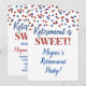 Invitaciones del partido de retiro personalizado en un patrón de confetti azul y purpurina rojo. Añade tu nombre y detalles del fiesta para una invitación única y elegante a la fiesta de retiro.