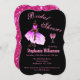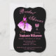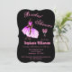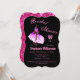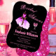 Una invitación brillante rosa y negra con ducha de novia con un bonito vestido rosa y una gran proa sobre un muñeco de modista en la parte delantera de la tarjeta, un par de copas de champán llenas de champán rosa (¡¿qué más?!) y un brillante patrón rosa en la parte trasera de la invitación. Por supuesto, todos los detalles pueden ser personalizados para adaptarse.