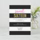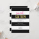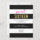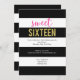 Esta moderna y divertida invitación a la fiesta de 16 años incluye un fondo de rayas blancas y negras con texto cursivo rosa caliente y texto falso purpurina.