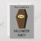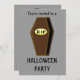 Esta espeluznante invitación a la fiesta de Halloween incluye un ataúd espeluznante hecho de madera con un borde dorado. La tapa del ataúd está ligeramente abierta, lo que revela sólo oscuridad en el interior. La placa dorada en la parte delantera del ataúd tiene un espeluznante texto negro que dice RIP, sin dar idea de quién o qué puede estar acechando dentro. Este divertido pero siniestro ataúd es ideal para Halloween. El fondo gris oscuro actúa para atraer el ojo del observador hacia el ataúd de la fatalidad. Hay texto de personalizable en la parte posterior para que puedas personalizar esta invitación.