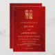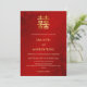 This elegant Chinese wedding invitation features an artistic gold double happiness symbol on a floral ruby red shimmering background. Bride and groom names in an elegant modern font. Chinese wedding invitation or tea ceremony invitation. With a scannable qr code and a photo at the backside.