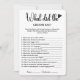 ¿Qué dijo el Groom? Juego de ducha de novia | Elegante Invitación a la ducha de bodas Trae risas, amor y algunas sorpresas a tu celebración con nuestro What Do the Groom Say? Juego de ducha de novia | Elegante Invitación a la ducha de bodas: una animada e hilarante actividad que permite a los invitados descubrir lo bien que la novia conoce a su novio. Con caligrafía moderna, flores de color suave y un diseño minimalista limpio, este juego combina el encanto y la diversión en un momento inolvidable de ducha de novias. Perfecto para duchas de novias, fiestas de soltera, duchas de boda, o incluso eventos de brunch y burbujeante, este juego le pide a la novia que adivine cómo su novio respondió a una serie de preguntas divertidas y personales — como "¿Cuál es su comida favorita?" o "¿Cuál fue su primera cita?" ¡A los invitados les encantará escuchar sus respuestas y las de él! Puedes personalizar esta carta con el nombre de la novia, la fecha del evento y hacer coincidir el diseño con tu tema, ya sea vegetación botánica, jardín de flores silvestres, algo azul o rústico moderno. Es una fantástica incorporación a un paquete de juegos, mesa de bienvenida o un lugar de huéspedes. Imprimida con cartón de primera calidad, esta actividad es perfecta para celebraciones en persona o virtuales y hace de la novia un recuerdo memorable. 🖤 Haga clic en Personalizar ahora para diseñar su juego What Do the Groom Say Game y crear una ducha de novia llena de alegría, risas y amor. Lo que dijo el novio fue juego, elegante actividad de ducha de novias, adivinando el juego imprimible, moderno juego de ducha de bodas, juego de fiesta de novias floral, tarjeta de novia caligráfica, juego de palabras del novio acuarela, juego de ducha de novia minimalista, actividad rústica de ducha de novias, divertida trivia preguntas