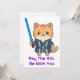 Adorable gato atigrado pelirrojo vestido de Jedi sosteniendo un sable de luz azul con el texto Que el 4 de mayo esté contigo.