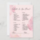 Eleva tu ducha de novia con el cautivador juego "What's in Your Purse", una deliciosa adición que promete risas, camaradería y un toque de elegancia moderna. Con un impresionante fondo rosa y rubio, decorado con delicados flecos de oro y brillantes elementos purpurinas decorativos, este juego crea un ambiente de belleza y celebración que hará que su reunión sea verdaderamente inolvidable. La moda del alfabeto negro moderno fuente de "What's in Your Purse" extiende una elegante invitación a los participantes, iniciando un emocionante viaje de descubrimiento. Mientras exploran sus bolsas, los huéspedes descubrirán una variedad de artículos, cada uno con un valor de punto único que va de 5 a 20 puntos. Esta adaptación creativa de un juego clásico introduce un elemento de competencia amistosa y diversión compartida a su evento. Diseñados con gran claridad y facilidad de uso, los objetos de juego se presentan en un tipo de letra de bloque negro depurado, lo que garantiza que los huéspedes de todas las edades puedan participar sin esfuerzo. Las etiquetas "name" y "total", adornadas con un elegante tipo de letra cursiva negra y líneas de acompañamiento, introducen un toque de sofisticación en el diseño general. El juego "What's in Your Purse", enmarcado en un marco de tonos rosas y ruidosos modernos, adornado con elegantes flecos de oro y encantadores elementos purpurinas decorativos, se convierte en una pieza central fascinante que se completa con cualquier decoración de ducha de novias. Más allá de su valor de entretenimiento, este juego fomenta las conexiones ya que los huéspedes comparten historias sobre sus hallazgos únicos. Eleva tu ducha nupcial con el juego "What's in Your Purse", donde el espíritu del descubrimiento se armoniza con la alegría de la unión. Este juego transforma tu celebración en una experiencia de memoria, llena de risas, conexiones y sorpresas conmovedoras. Prepárese para una ducha que irradia encanto y celebración, donde se fortalecen las amistades y se celebran lazos con un telón de fondo de elegancia moderna, con fascinantes tonos rosa y rubor adornados con brillantes acentos.