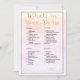 Sumérjase en el encantador mundo del juego "What's in Your Purse", una deliciosa adición a su ducha de novias que promete risas, camaradería y un toque de fantasía. Este juego, situado sobre un fondo de gradiente de nubes pastel, crea una atmósfera de serenidad y diversión, haciendo que su celebración sea verdaderamente memorable. El cautivador guión dorado de las palabras "What's in Your Purse" invita a los huéspedes a embarcarse en una aventura divertida. Mientras exploran sus bolsas, descubrirán una serie de artículos, cada uno con un valor de punto distinto de 5 a 20 puntos. Este giro creativo en un juego tradicional añade un elemento de competencia amistosa y disfrute compartido a su evento. Diseñados con claridad y simplicidad en mente, los elementos de juego se presentan en un tipo de letra de bloque negro limpio, lo que garantiza una fácil identificación para todos los participantes. Las etiquetas "name" y "total", junto con sus líneas de acompañamiento en un elegante tipo de letra cursiva dorada, añaden un toque de sofisticación al diseño general. El juego What's in Your Purse, enmarcado con un borde negro clásico, se convierte en un elegante centro de decoración que se completa con una ducha de novia. Más allá de su valor de entretenimiento, este juego anima a las conexiones ya que los invitados comparten historias sobre sus hallazgos únicos. Eleva tu ducha de novia con el juego "What's in Your Purse", donde el espíritu del descubrimiento se encuentra con la alegría de la unión. Este juego transforma tu celebración en una experiencia inolvidable, llena de risas, conexiones y sorpresas reconfortantes. Prepárese para una ducha que irradia encanto y celebración, donde se fortalecen las amistades y se celebran lazos en medio de nubes pastel.