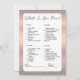 Eleva la alegría de tu ducha de novia con el divertido juego "What's in Your Purse" (Qué hay en tu bolso). Diseñada para crear risas y conexiones, esta deliciosa actividad anima a sus huéspedes a explorar sus bolsos e identificar varios artículos de una lista cuidadosamente seleccionada. Con artículos de valor entre 5 y 20 puntos, el juego introduce una ventaja competitiva amistosa que tendrá a todos con ganas de participar. La presentación del juego tiene un fondo blanco limpio adornado con un toque de glamour —un rosa borde de puntos de polka dorados— que le da un balance perfecto entre elegancia atemporal y estilo contemporáneo. La cautivadora frase "What's in Your Purse" ocupa del centro del escenario con un sofisticado tipo de letra de escritura moderna y negra, atrayendo a sus invitados y marcando el tono para una experiencia divertida e interactiva. La lista de elementos de juego se muestra en un sencillo tipo de letra de bloque negro, lo que garantiza una clara visibilidad y facilidad de uso para todos los participantes. Las palabras "nombre" y "total", acompañadas de elegantes líneas cursivas, se representan con una letra cursiva negra en bonito, añadiendo un toque elegante al diseño del juego. Con su inmaculado fondo blanco y su exquisito borde de puntos de la polka dorada subió, el atractivo visual de este juego complementa sin esfuerzo cualquier tema de la ducha de novias, añadiendo un toque de sofisticación y encanto a su evento. A medida que sus huéspedes hurgan en sus bolsillos y marquen los objetos descubiertos, la sala se llenará de risas, charlas y recuerdos compartidos, creando un ambiente inolvidable. "Lo que está en tu bolso" trasciende ser sólo un juego —es un encantador rompehielos que fomenta las conexiones entre los invitados y celebra la ocasión especial de la futura novia. Con este encantador juego en juego, tu ducha de novia seguramente será un evento que todos valoramos y que recordamos con cariño en los próximos años.