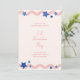 Celebre el cumpleaños de Estados Unidos con esta divertida y patriótica invitación para una fiesta de bbq en el patio trasero el 4 de julio con rayas rojas festivas y estrellas azules sobre un fondo de color marfil.